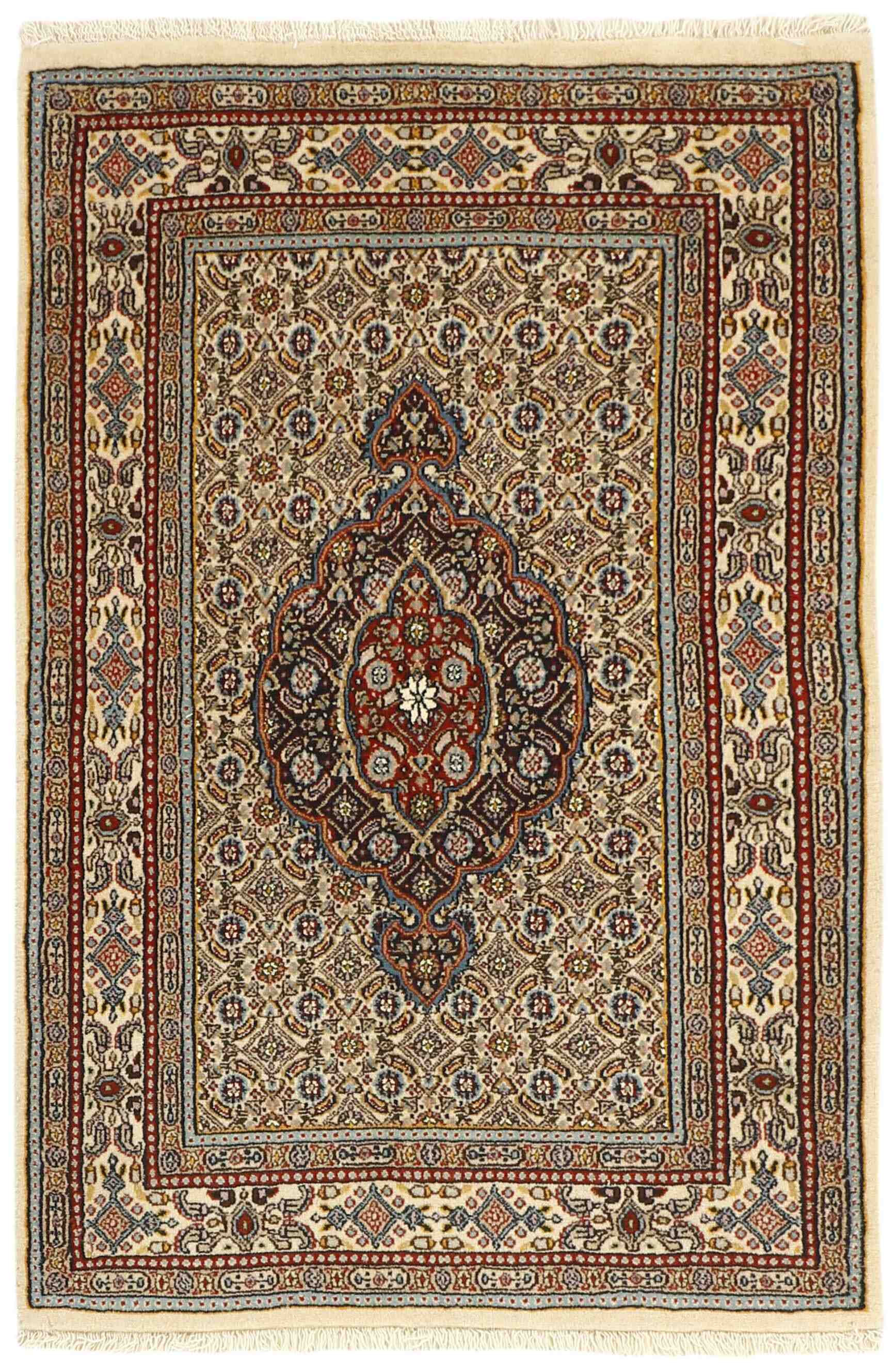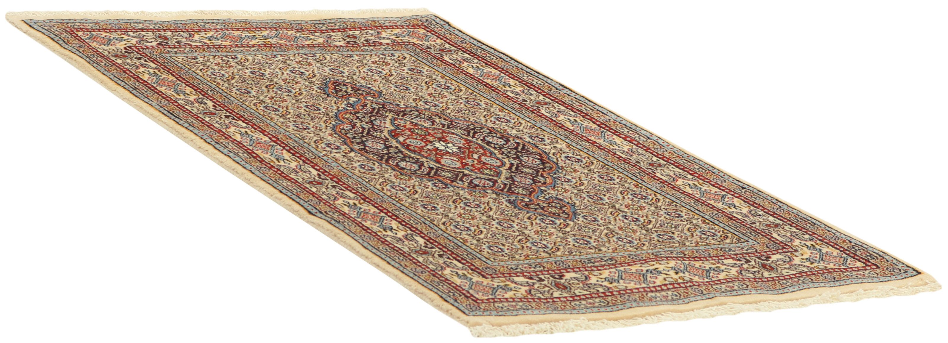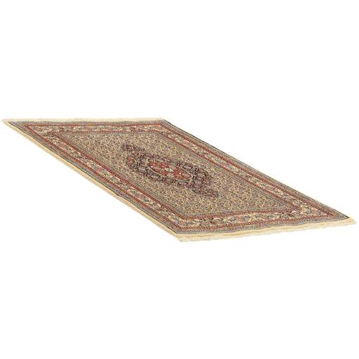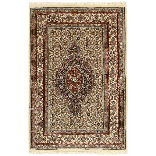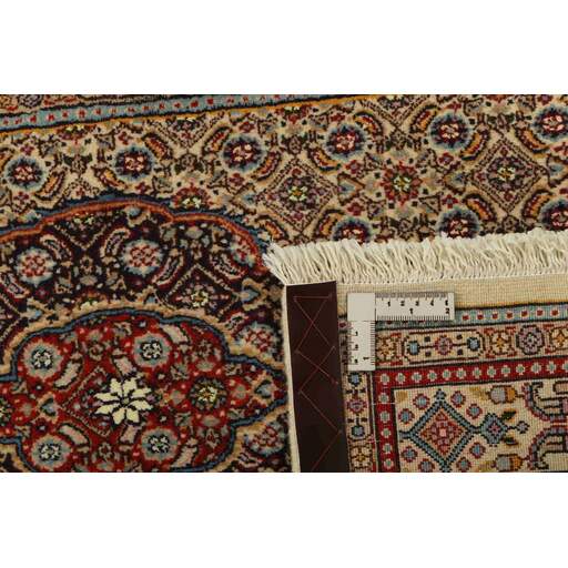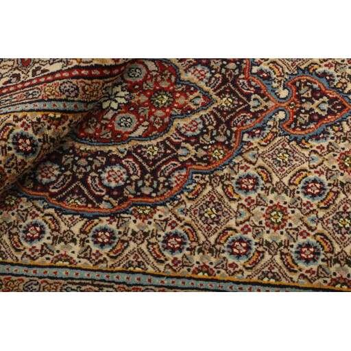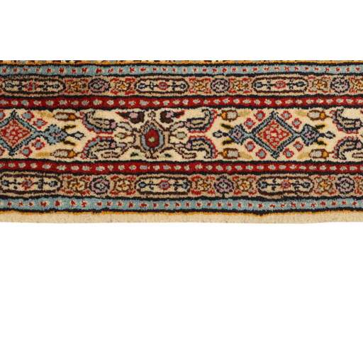 Moud est une petite ville au sud de Mashad, dans la province de Khorrasan. Les tapis de cette région se caractérisent par l'homogénéité de leurs motifs et de leur qualité. La chaîne et la trame sont en coton et le velours en laine. Les bordures sont une version de la bordure persane traditionnelle en tortue. Les tapis sont fabriqués dans toutes les tailles. Les tapis Moud sont souvent copiés en Inde, en raison de leur remarquable homogénéité. Les motifs caractéristiques de Moud sont parmi les plus uniformes, les plus réguliers et les plus facilement reconnaissables de la province de Khorrasan. Les Moud Mahi sont fabriqués dans des tons beige, rouge clair ou bleu, avec des motifs Mahi sur toute la surface ou avec un médaillon en forme d'étoile. Mahi signifie poisson et le motif Mahi est le motif le plus couramment utilisé dans les véritables tapis persans. En l'observant de près, vous pouvez voir un étang entouré de quatre poissons.