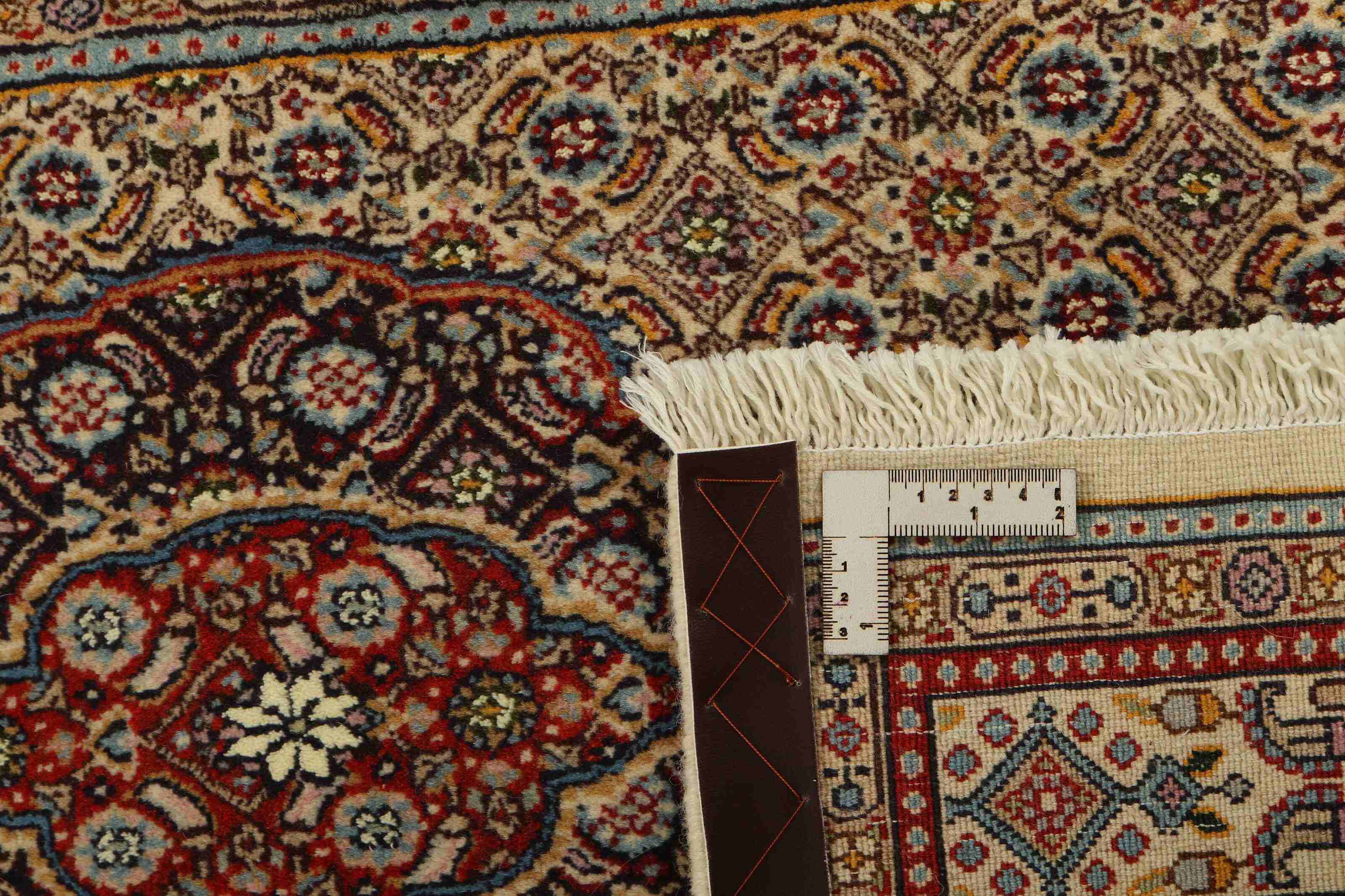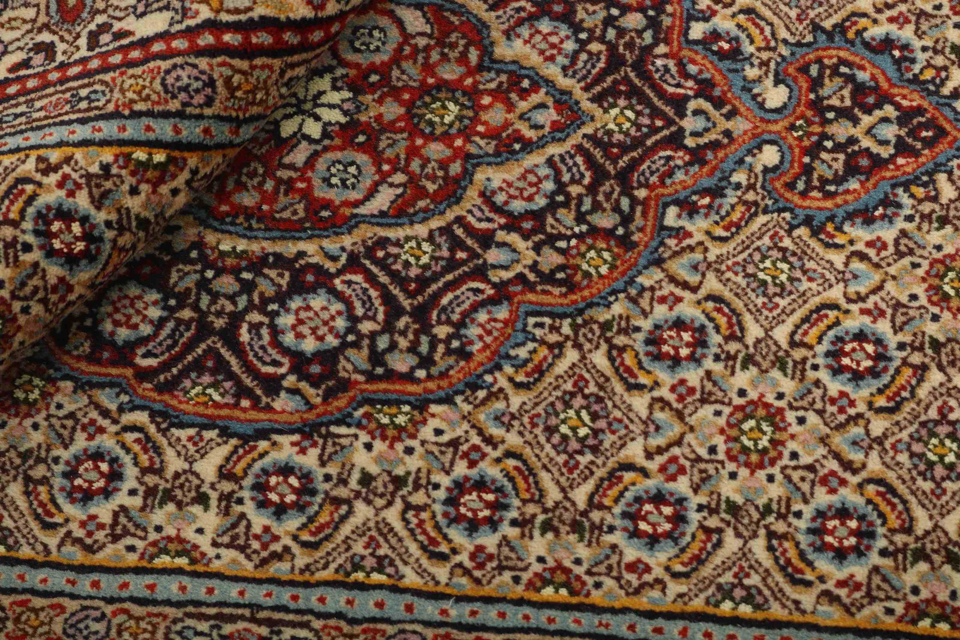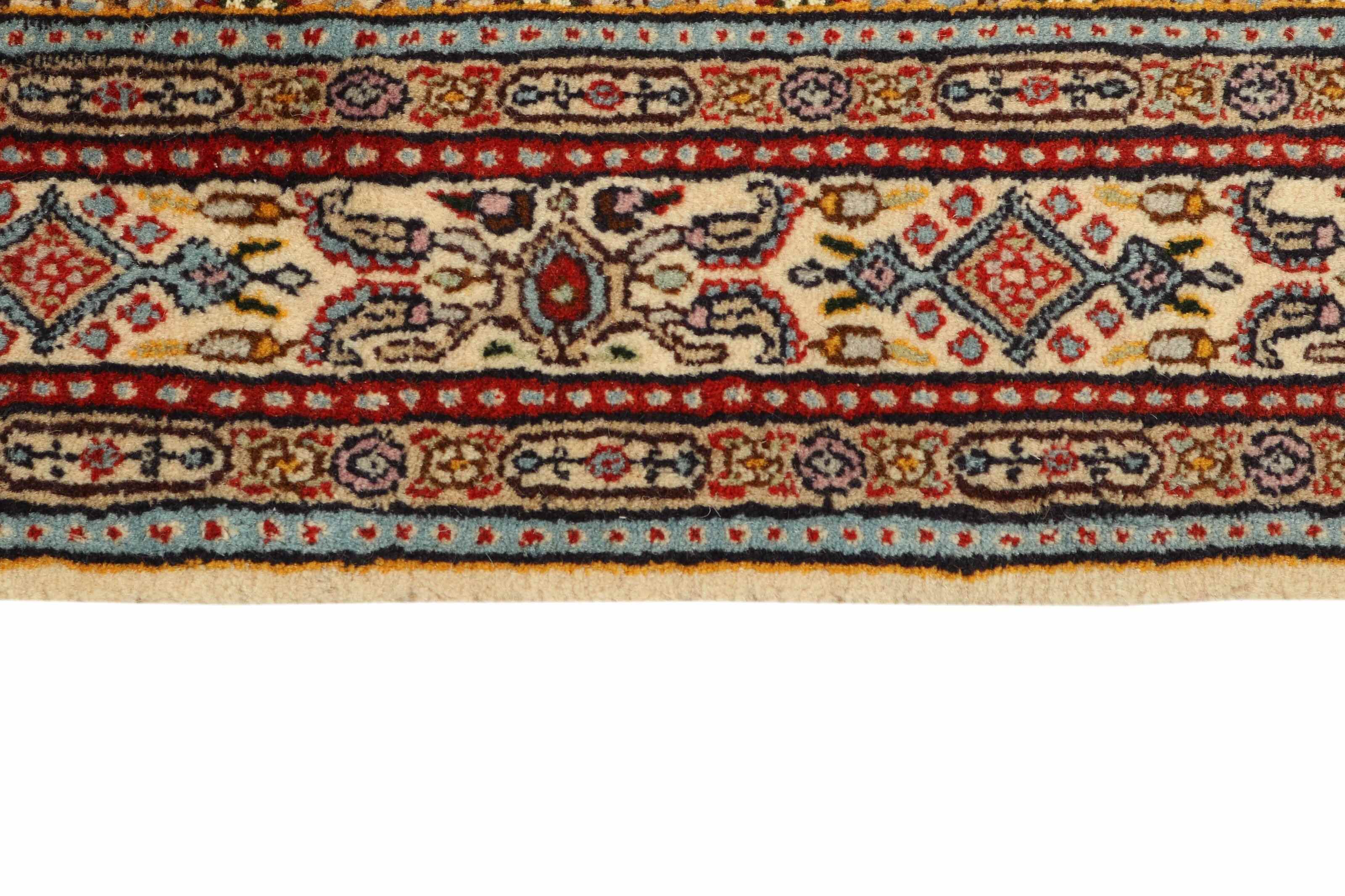 Moud est une petite ville au sud de Mashad, dans la province de Khorrasan. Les tapis de cette région se caractérisent par l'homogénéité de leurs motifs et de leur qualité. La chaîne et la trame sont en coton et le velours en laine. Les bordures sont une version de la bordure persane traditionnelle en tortue. Les tapis sont fabriqués dans toutes les tailles. Les tapis Moud sont souvent copiés en Inde, en raison de leur remarquable homogénéité. Les motifs caractéristiques de Moud sont parmi les plus uniformes, les plus réguliers et les plus facilement reconnaissables de la province de Khorrasan. Les Moud Mahi sont fabriqués dans des tons beige, rouge clair ou bleu, avec des motifs Mahi sur toute la surface ou avec un médaillon en forme d'étoile. Mahi signifie poisson et le motif Mahi est le motif le plus couramment utilisé dans les véritables tapis persans. En l'observant de près, vous pouvez voir un étang entouré de quatre poissons.