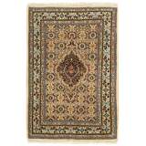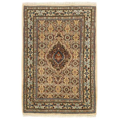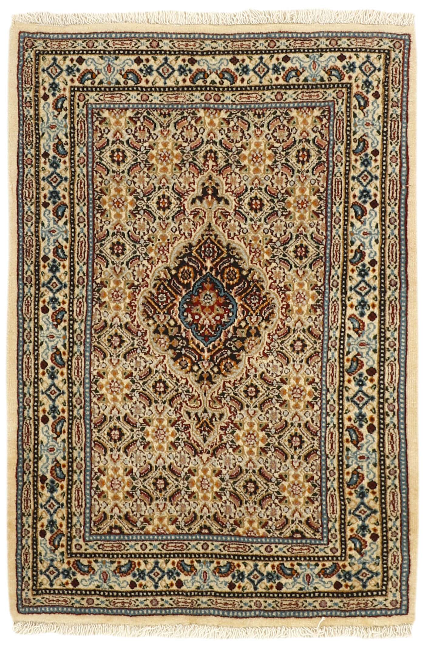 Moud est une petite ville au sud de Mashad, dans la province de Khorrasan. Les tapis de cette région se caractérisent par l'homogénéité de leurs motifs et de leur qualité. La chaîne et la trame sont en coton et le velours en laine. Les bordures sont une version de la bordure persane traditionnelle en tortue. Les tapis sont fabriqués dans toutes les tailles. Les tapis Moud sont souvent copiés en Inde, en raison de leur remarquable homogénéité. Les motifs caractéristiques de Moud sont parmi les plus uniformes, les plus réguliers et les plus facilement reconnaissables de la province de Khorrasan. Les Moud Mahi sont fabriqués dans des tons beige, rouge clair ou bleu, avec des motifs Mahi sur toute la surface ou avec un médaillon en forme d'étoile. Mahi signifie poisson et le motif Mahi est le motif le plus couramment utilisé dans les véritables tapis persans. En l'observant de près, vous pouvez voir un étang entouré de quatre poissons.