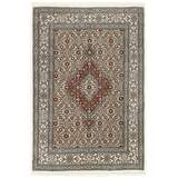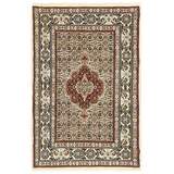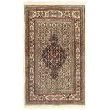Moud est une petite ville au sud de Mashad, dans la province de Khorrasan. Les tapis de cette région se caractérisent par l'homogénéité de leurs motifs et de leur qualité. La chaîne et la trame sont en coton et le velours en laine. Les bordures sont une version de la bordure persane traditionnelle en tortue. Les tapis sont fabriqués dans toutes les tailles. Les tapis Moud sont souvent copiés en Inde, en raison de leur remarquable homogénéité. Les motifs caractéristiques de Moud sont parmi les plus uniformes, les plus réguliers et les plus facilement reconnaissables de la province de Khorrasan. Les Moud Mahi sont fabriqués dans des tons beige, rouge clair ou bleu, avec des motifs Mahi sur toute la surface ou avec un médaillon en forme d'étoile. Mahi signifie poisson et le motif Mahi est le motif le plus couramment utilisé dans les véritables tapis persans. En l'observant de près, vous pouvez voir un étang entouré de quatre poissons.
