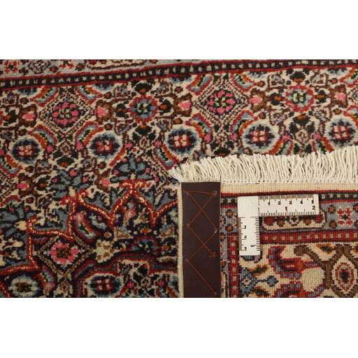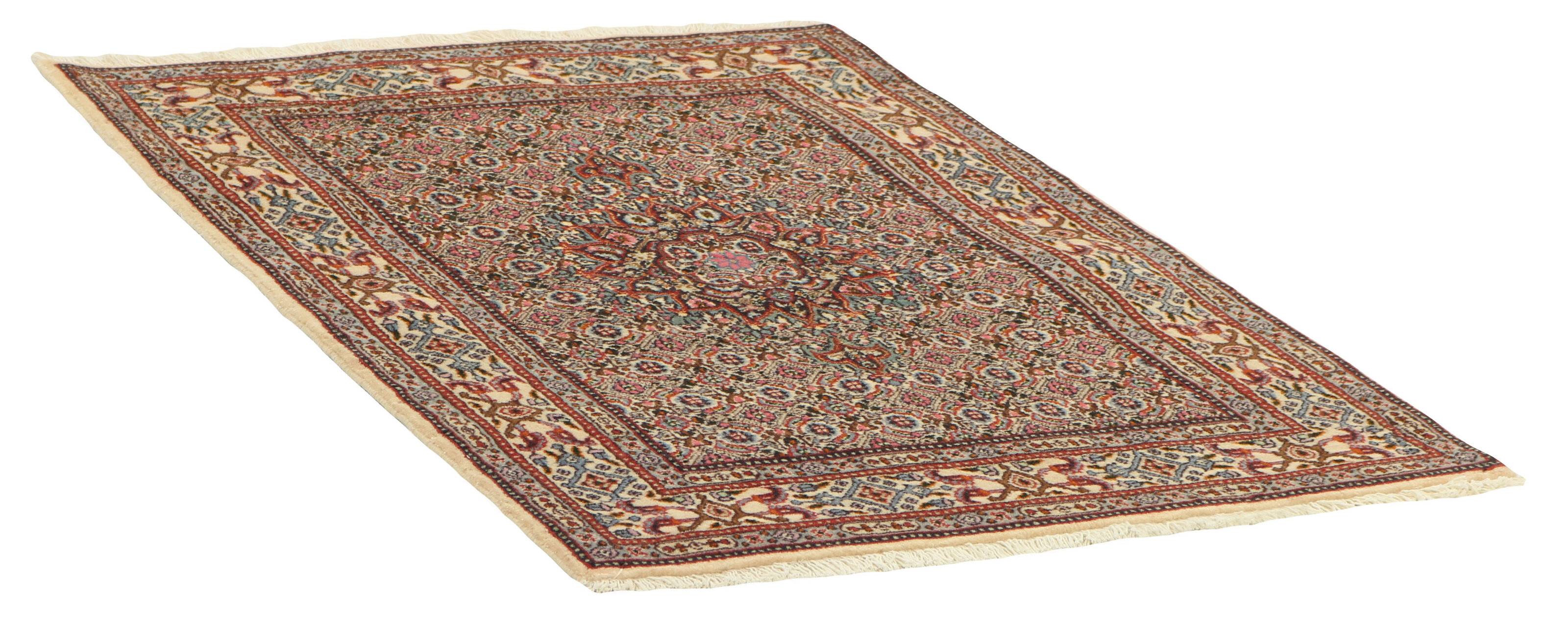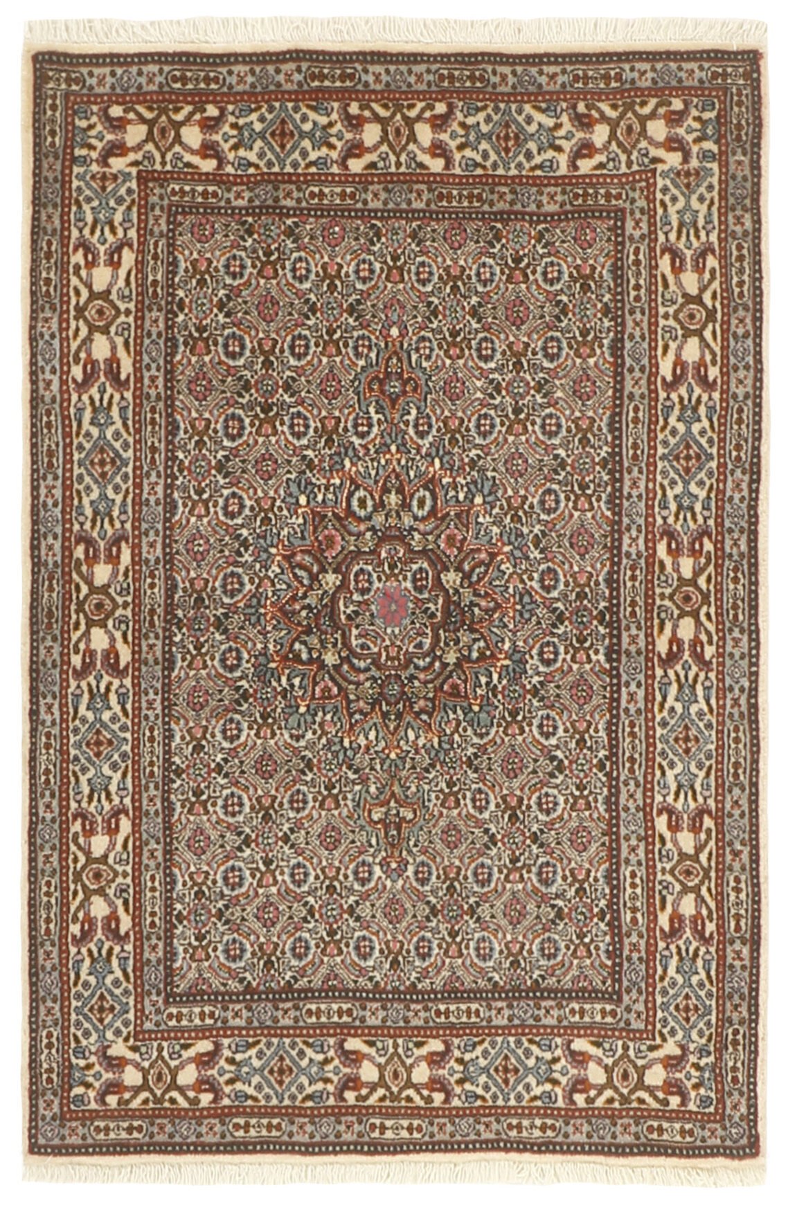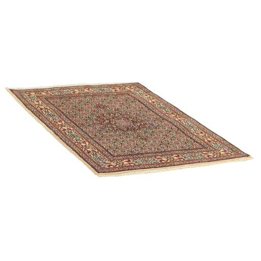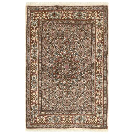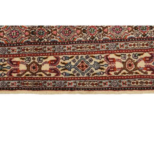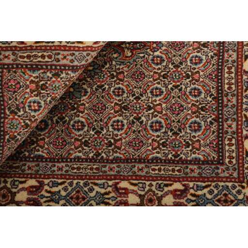 Moud est une petite ville au sud de Mashad, dans la province de Khorrasan. Les tapis de cette région se caractérisent par l'homogénéité de leurs motifs et de leur qualité. La chaîne et la trame sont en coton et le velours en laine. Les bordures sont une version de la bordure persane traditionnelle en tortue. Les tapis sont fabriqués dans toutes les tailles. Les tapis Moud sont souvent copiés en Inde, en raison de leur remarquable homogénéité. Les motifs caractéristiques de Moud sont parmi les plus uniformes, les plus réguliers et les plus facilement reconnaissables de la province de Khorrasan. Les Moud Mahi sont fabriqués dans des tons beige, rouge clair ou bleu, avec des motifs Mahi sur toute la surface ou avec un médaillon en forme d'étoile. Mahi signifie poisson et le motif Mahi est le motif le plus couramment utilisé dans les véritables tapis persans. En l'observant de près, vous pouvez voir un étang entouré de quatre poissons.