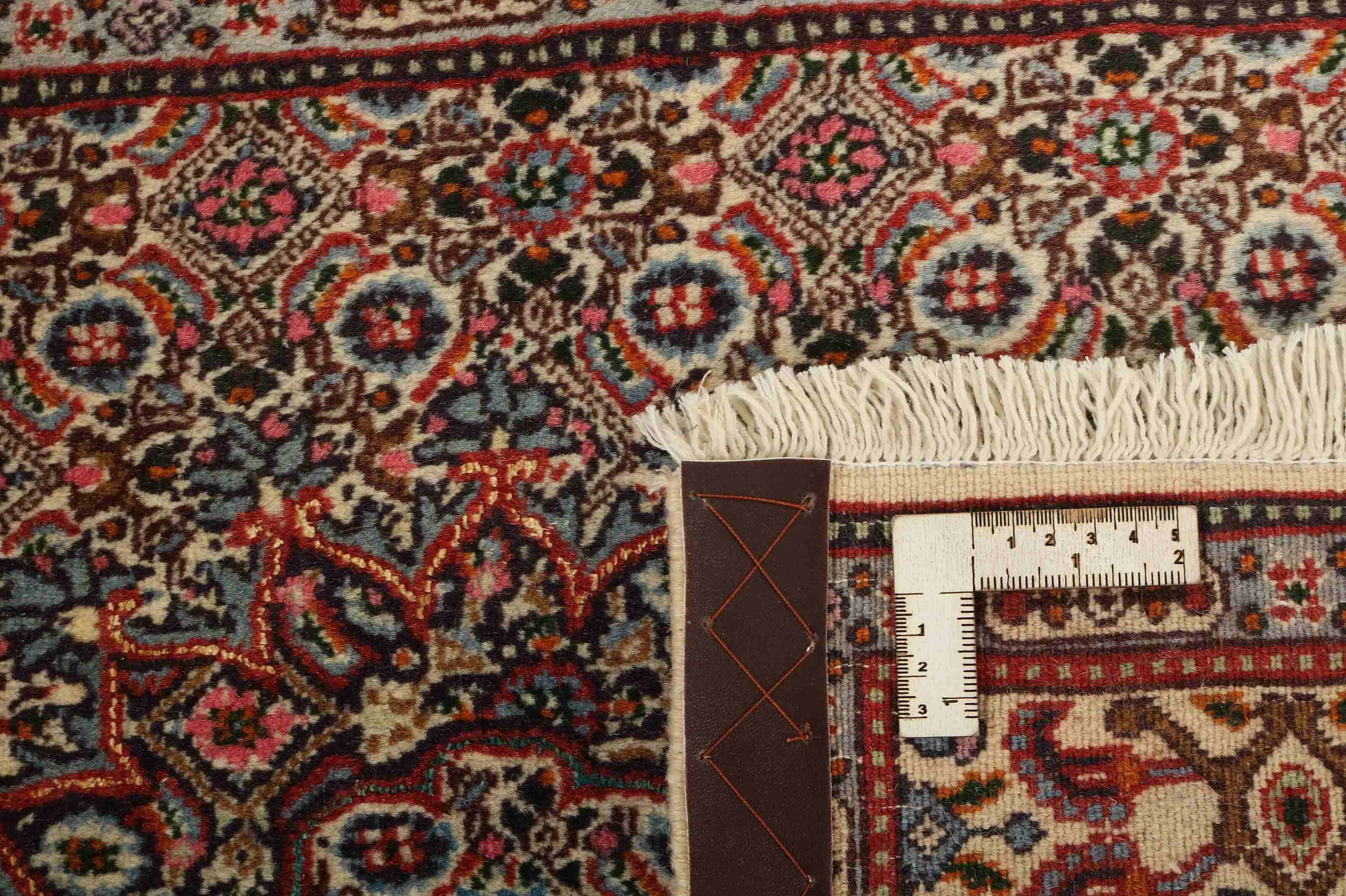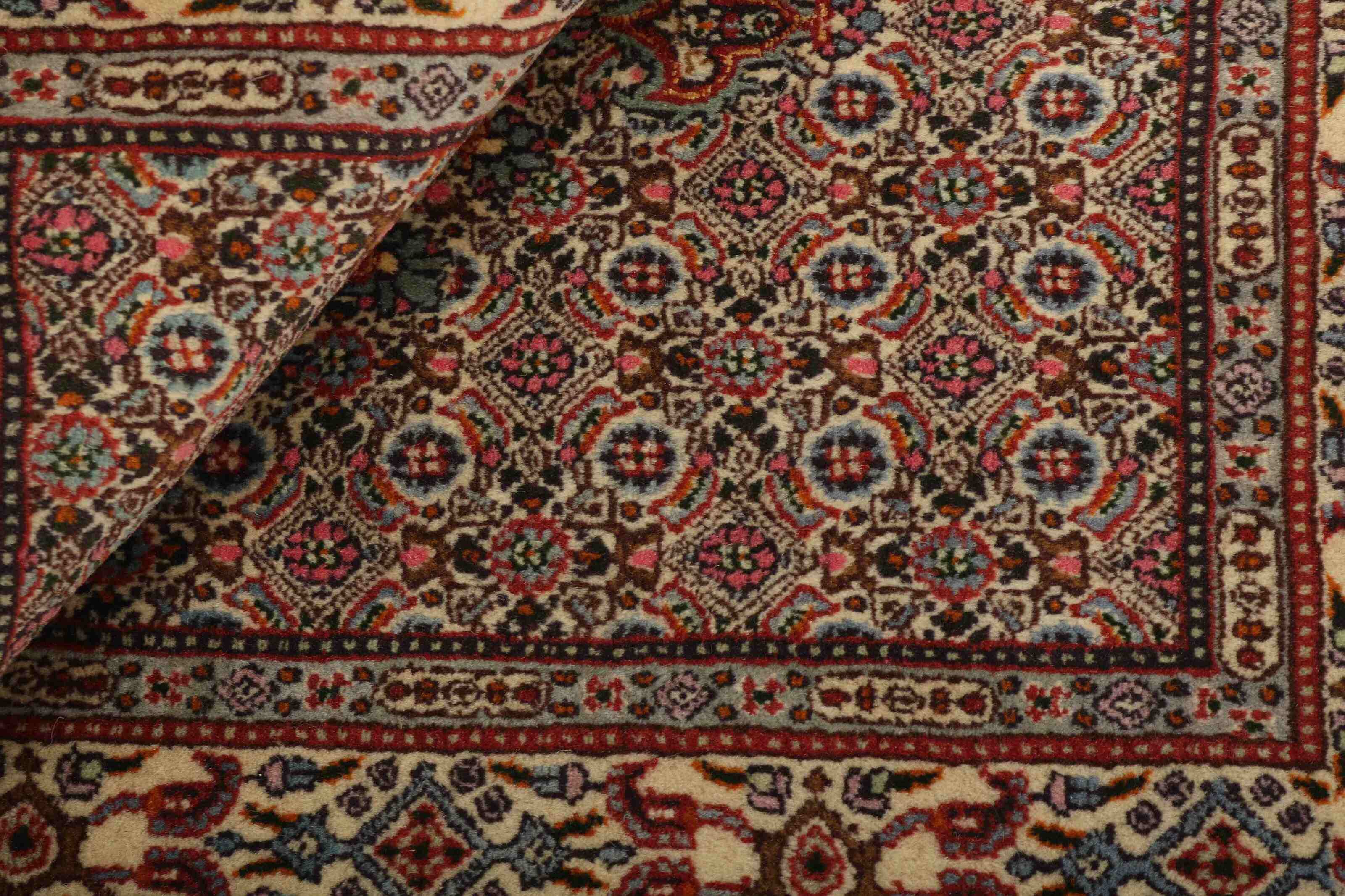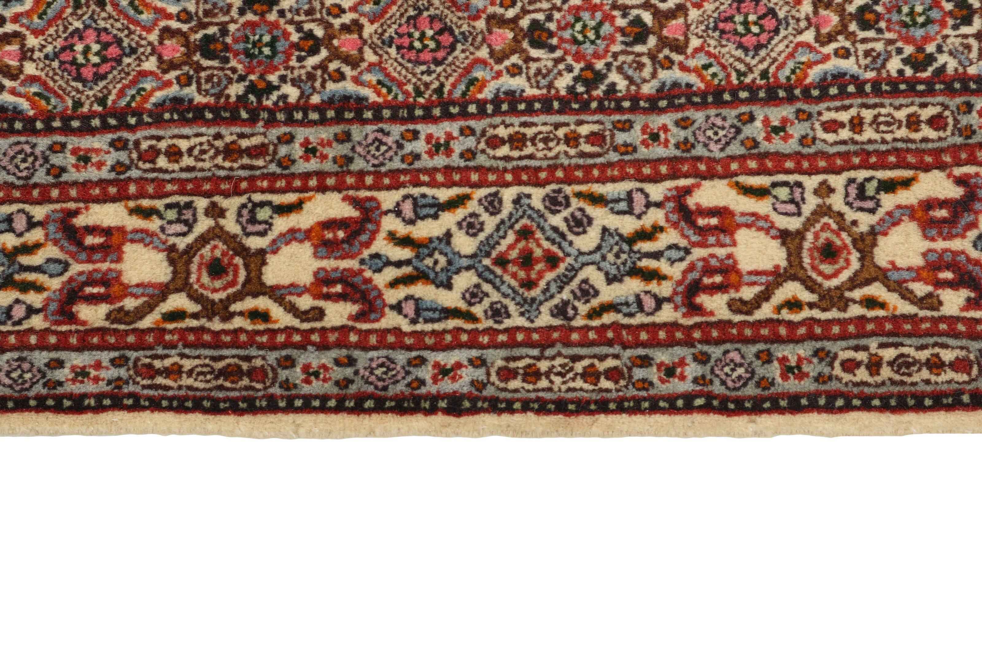 Moud est une petite ville au sud de Mashad, dans la province de Khorrasan. Les tapis de cette région se caractérisent par l'homogénéité de leurs motifs et de leur qualité. La chaîne et la trame sont en coton et le velours en laine. Les bordures sont une version de la bordure persane traditionnelle en tortue. Les tapis sont fabriqués dans toutes les tailles. Les tapis Moud sont souvent copiés en Inde, en raison de leur remarquable homogénéité. Les motifs caractéristiques de Moud sont parmi les plus uniformes, les plus réguliers et les plus facilement reconnaissables de la province de Khorrasan. Les Moud Mahi sont fabriqués dans des tons beige, rouge clair ou bleu, avec des motifs Mahi sur toute la surface ou avec un médaillon en forme d'étoile. Mahi signifie poisson et le motif Mahi est le motif le plus couramment utilisé dans les véritables tapis persans. En l'observant de près, vous pouvez voir un étang entouré de quatre poissons.