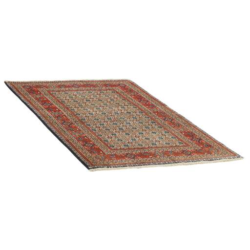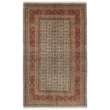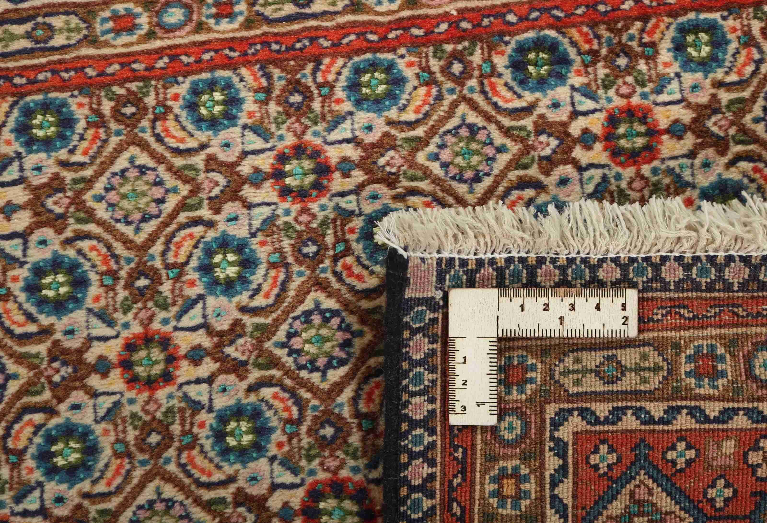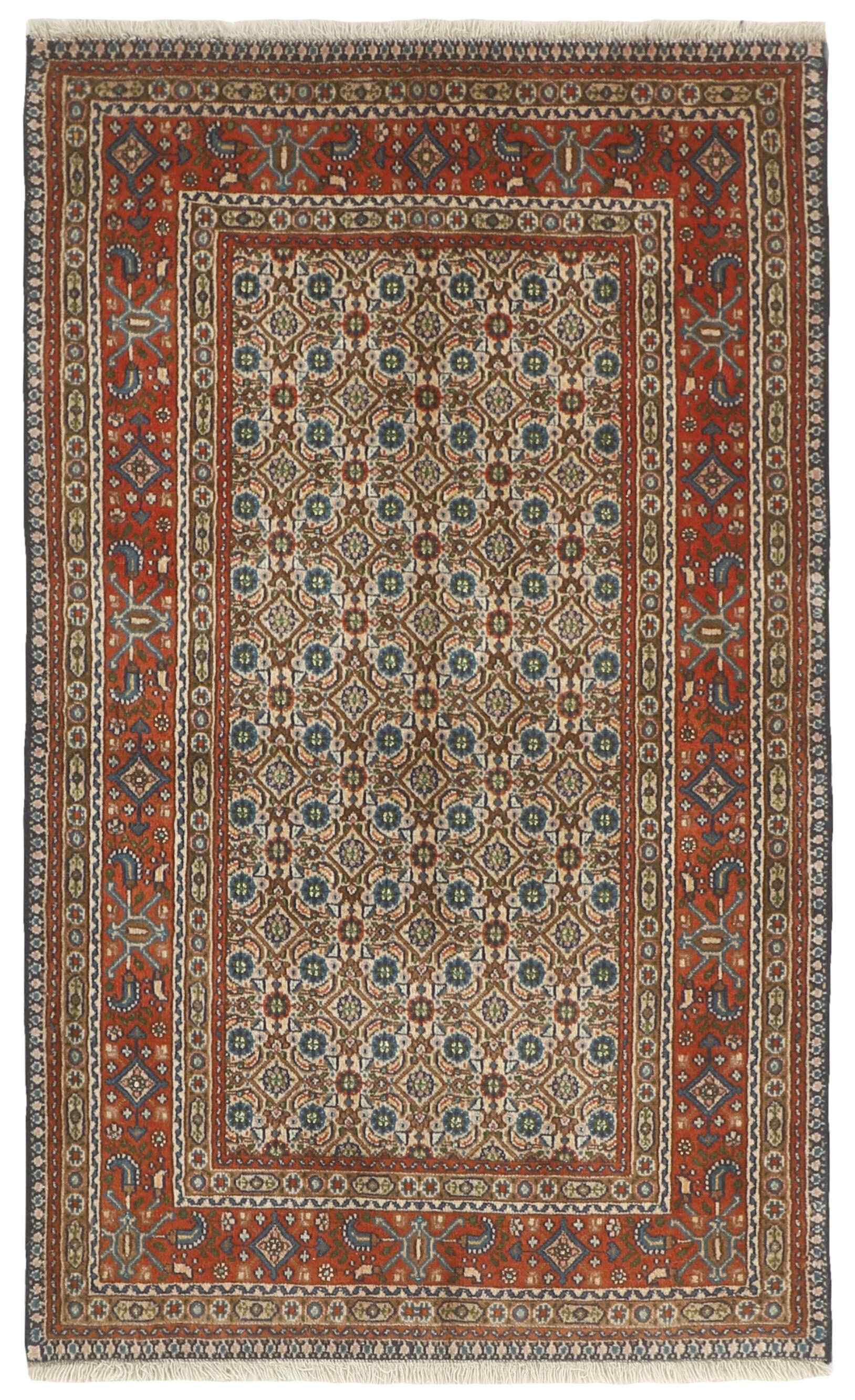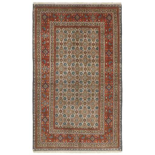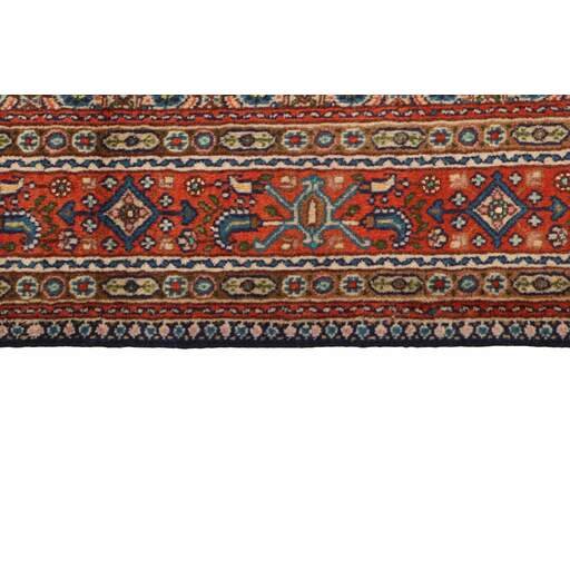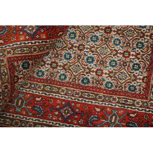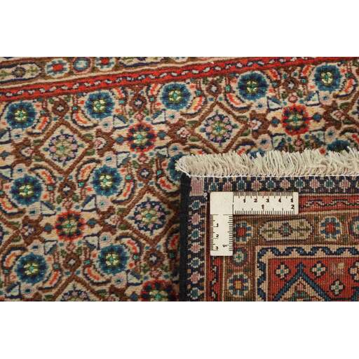 Moud est une petite ville au sud de Mashad, dans la province de Khorrasan. Les tapis de cette région se caractérisent par l'homogénéité de leurs motifs et de leur qualité. La chaîne et la trame sont en coton et le velours en laine. Les bordures sont une version de la bordure persane traditionnelle en tortue. Les tapis sont fabriqués dans toutes les tailles. Les tapis Moud sont souvent copiés en Inde, en raison de leur remarquable homogénéité. Les motifs caractéristiques de Moud sont parmi les plus uniformes, les plus réguliers et les plus facilement reconnaissables de la province de Khorrasan. Les Moud Mahi sont fabriqués dans des tons beige, rouge clair ou bleu, avec des motifs Mahi sur toute la surface ou avec un médaillon en forme d'étoile. Mahi signifie poisson et le motif Mahi est le motif le plus couramment utilisé dans les véritables tapis persans. En l'observant de près, vous pouvez voir un étang entouré de quatre poissons.