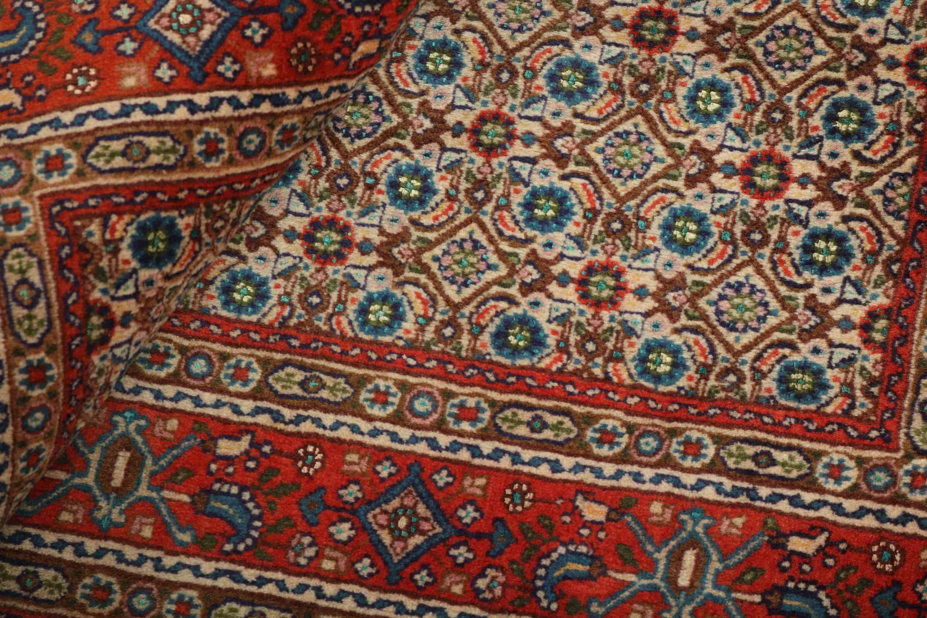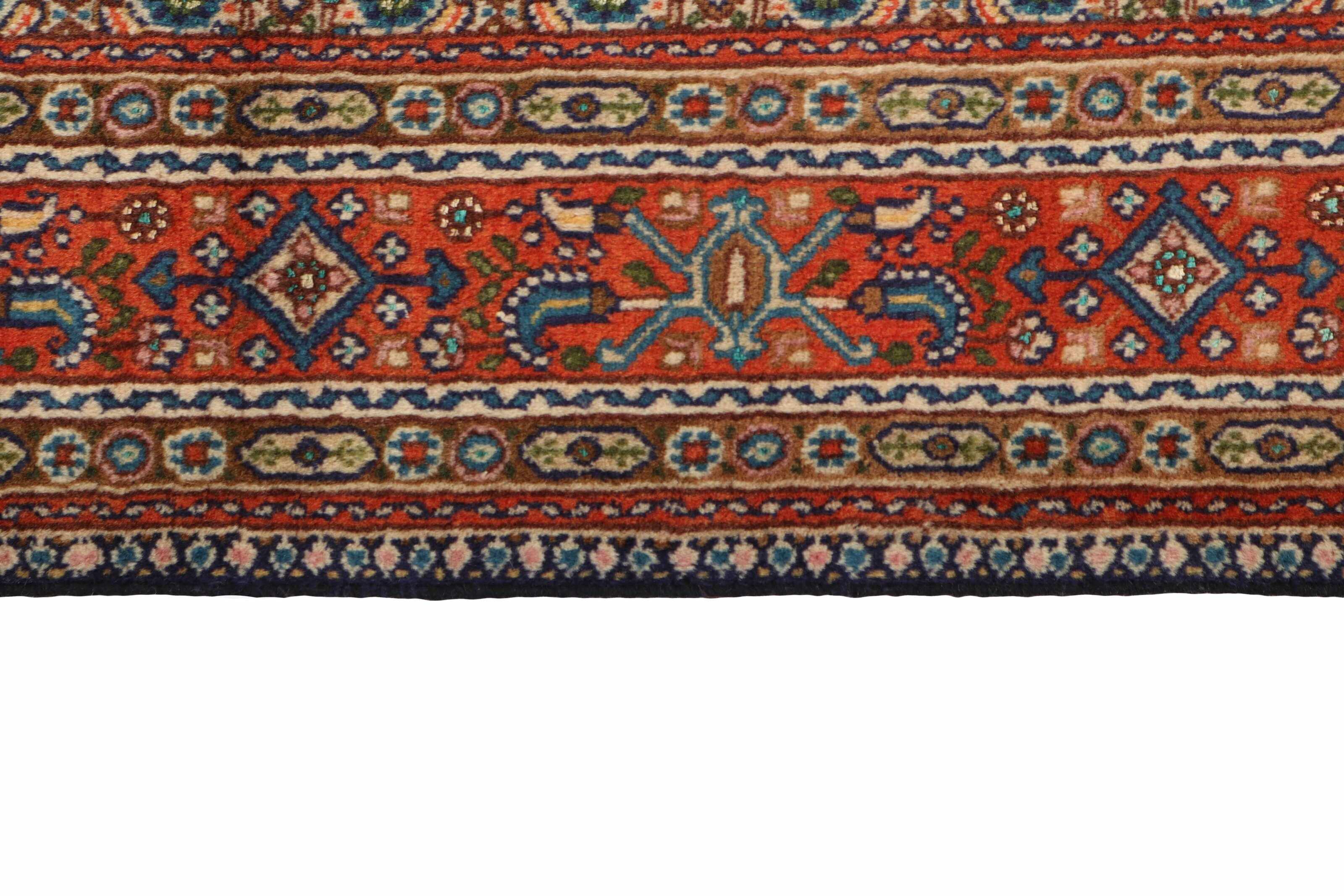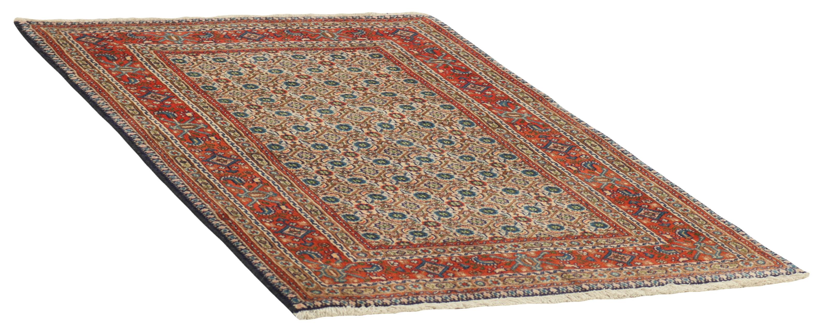 Moud est une petite ville au sud de Mashad, dans la province de Khorrasan. Les tapis de cette région se caractérisent par l'homogénéité de leurs motifs et de leur qualité. La chaîne et la trame sont en coton et le velours en laine. Les bordures sont une version de la bordure persane traditionnelle en tortue. Les tapis sont fabriqués dans toutes les tailles. Les tapis Moud sont souvent copiés en Inde, en raison de leur remarquable homogénéité. Les motifs caractéristiques de Moud sont parmi les plus uniformes, les plus réguliers et les plus facilement reconnaissables de la province de Khorrasan. Les Moud Mahi sont fabriqués dans des tons beige, rouge clair ou bleu, avec des motifs Mahi sur toute la surface ou avec un médaillon en forme d'étoile. Mahi signifie poisson et le motif Mahi est le motif le plus couramment utilisé dans les véritables tapis persans. En l'observant de près, vous pouvez voir un étang entouré de quatre poissons.