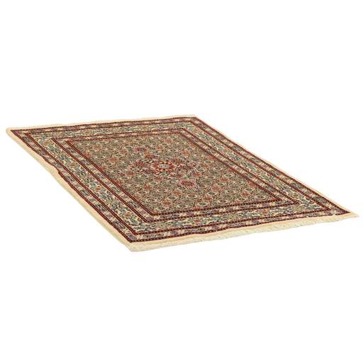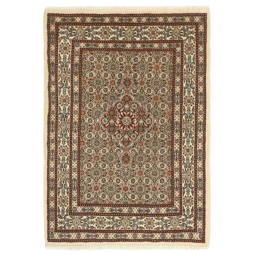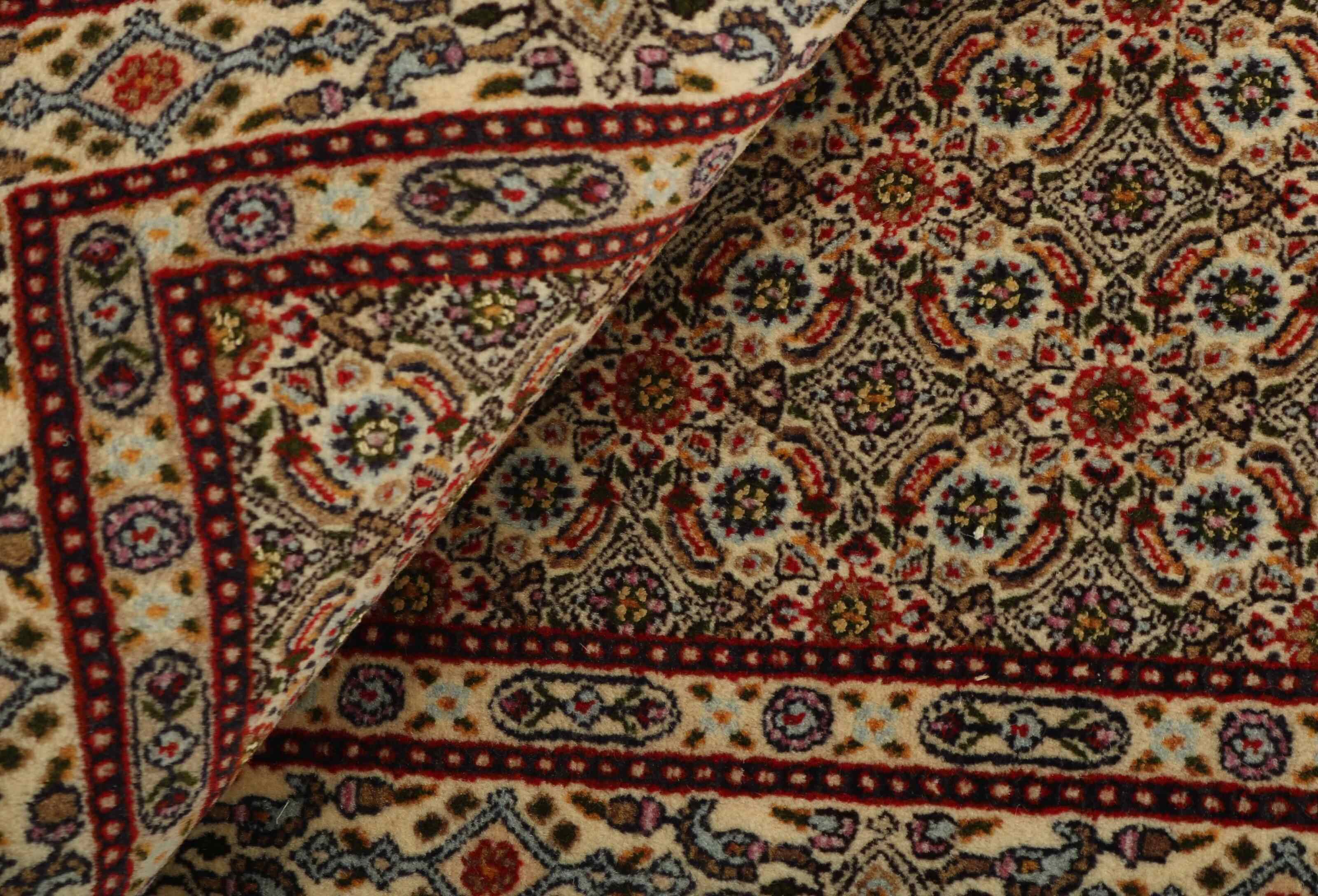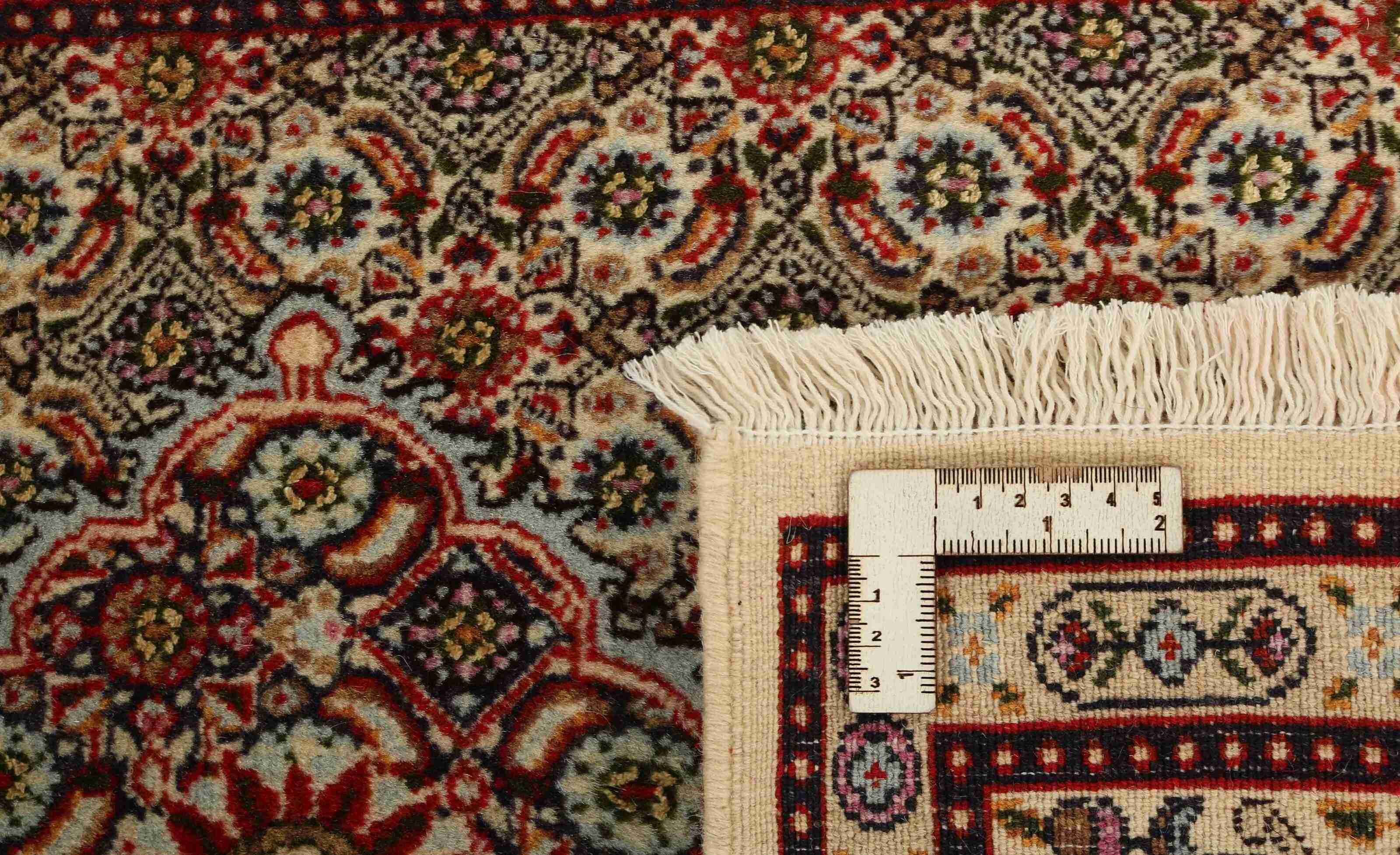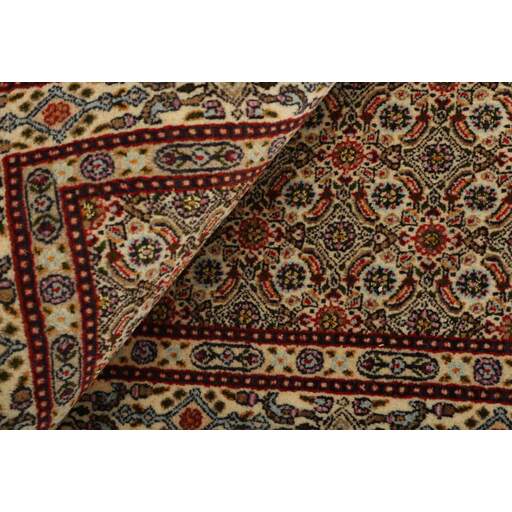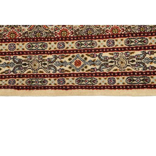 Moud est une petite ville au sud de Mashad, dans la province de Khorrasan. Les tapis de cette région se caractérisent par l'homogénéité de leurs motifs et de leur qualité. La chaîne et la trame sont en coton et le velours en laine. Les bordures sont une version de la bordure persane traditionnelle en tortue. Les tapis sont fabriqués dans toutes les tailles. Les tapis Moud sont souvent copiés en Inde, en raison de leur remarquable homogénéité. Les motifs caractéristiques de Moud sont parmi les plus uniformes, les plus réguliers et les plus facilement reconnaissables de la province de Khorrasan. Les Moud Mahi sont fabriqués dans des tons beige, rouge clair ou bleu, avec des motifs Mahi sur toute la surface ou avec un médaillon en forme d'étoile. Mahi signifie poisson et le motif Mahi est le motif le plus couramment utilisé dans les véritables tapis persans. En l'observant de près, vous pouvez voir un étang entouré de quatre poissons.