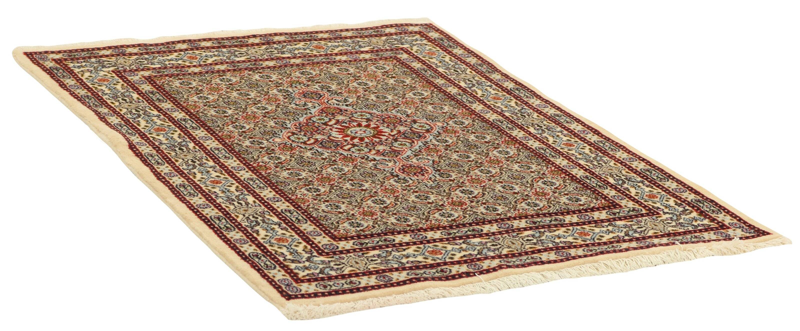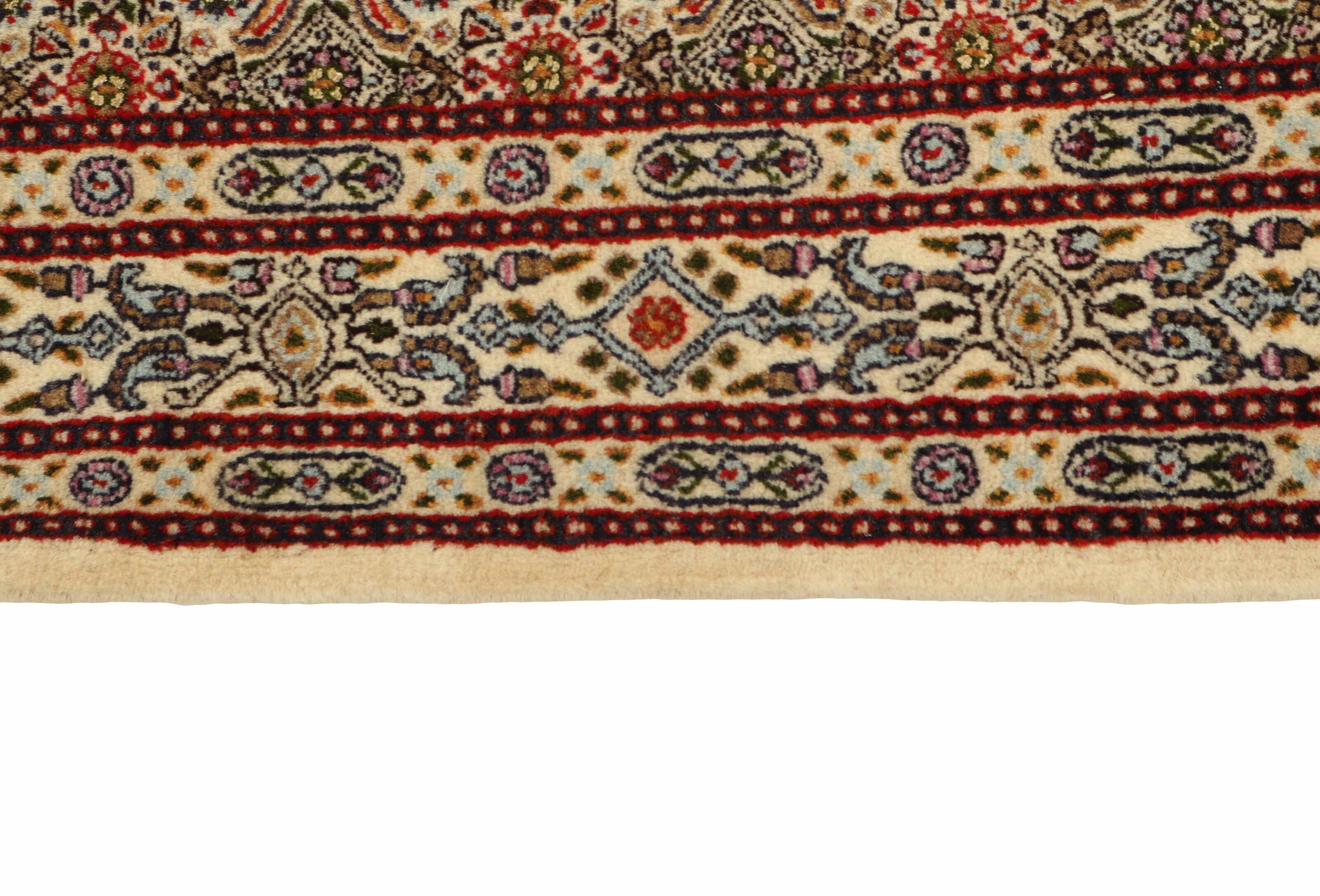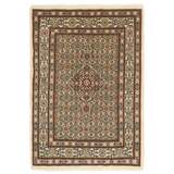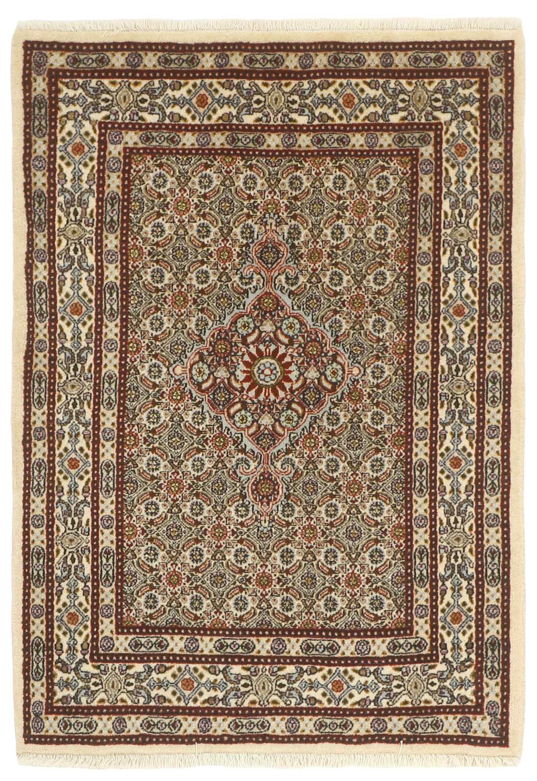 Moud est une petite ville au sud de Mashad, dans la province de Khorrasan. Les tapis de cette région se caractérisent par l'homogénéité de leurs motifs et de leur qualité. La chaîne et la trame sont en coton et le velours en laine. Les bordures sont une version de la bordure persane traditionnelle en tortue. Les tapis sont fabriqués dans toutes les tailles. Les tapis Moud sont souvent copiés en Inde, en raison de leur remarquable homogénéité. Les motifs caractéristiques de Moud sont parmi les plus uniformes, les plus réguliers et les plus facilement reconnaissables de la province de Khorrasan. Les Moud Mahi sont fabriqués dans des tons beige, rouge clair ou bleu, avec des motifs Mahi sur toute la surface ou avec un médaillon en forme d'étoile. Mahi signifie poisson et le motif Mahi est le motif le plus couramment utilisé dans les véritables tapis persans. En l'observant de près, vous pouvez voir un étang entouré de quatre poissons.