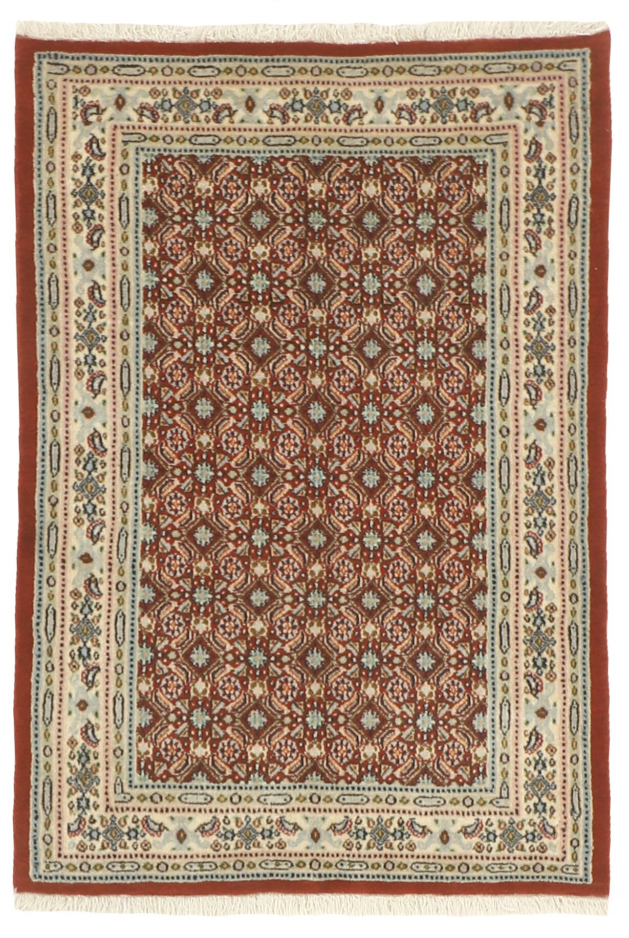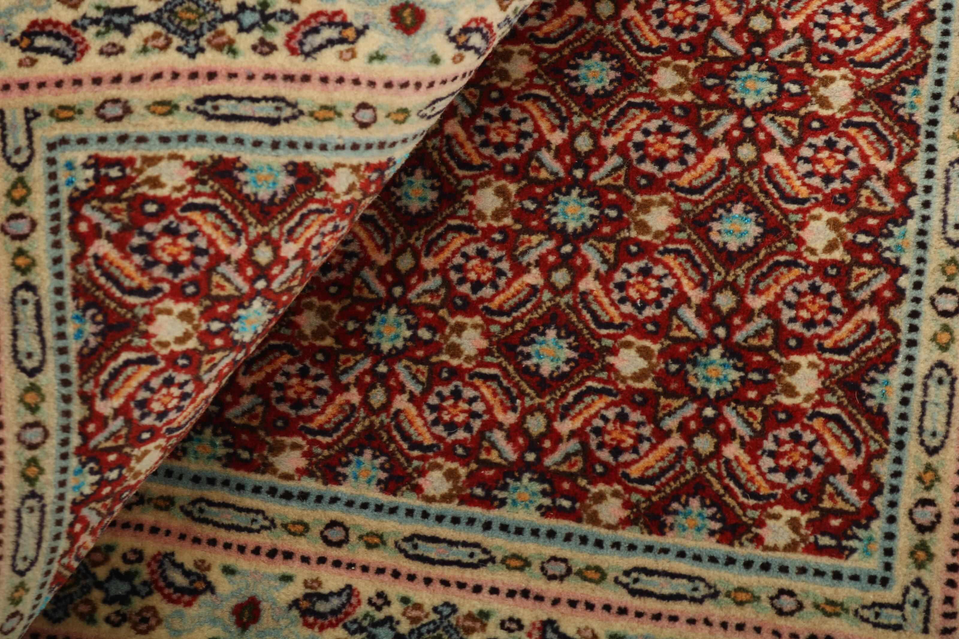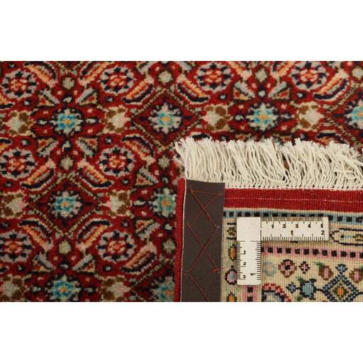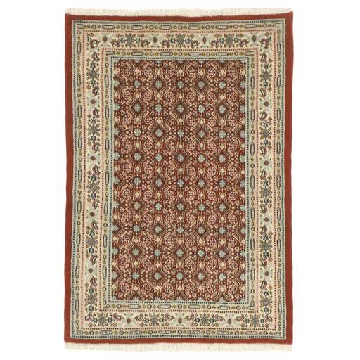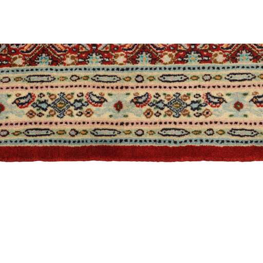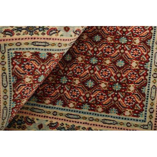 Moud est une petite ville au sud de Mashad, dans la province de Khorrasan. Les tapis de cette région se caractérisent par l'homogénéité de leurs motifs et de leur qualité. La chaîne et la trame sont en coton et le velours en laine. Les bordures sont une version de la bordure persane traditionnelle en tortue. Les tapis sont fabriqués dans toutes les tailles. Les tapis Moud sont souvent copiés en Inde, en raison de leur remarquable homogénéité. Les motifs caractéristiques de Moud sont parmi les plus uniformes, les plus réguliers et les plus facilement reconnaissables de la province de Khorrasan. Les Moud Mahi sont fabriqués dans des tons beige, rouge clair ou bleu, avec des motifs Mahi sur toute la surface ou avec un médaillon en forme d'étoile. Mahi signifie poisson et le motif Mahi est le motif le plus couramment utilisé dans les véritables tapis persans. En l'observant de près, vous pouvez voir un étang entouré de quatre poissons.