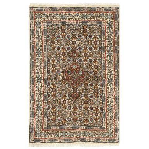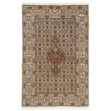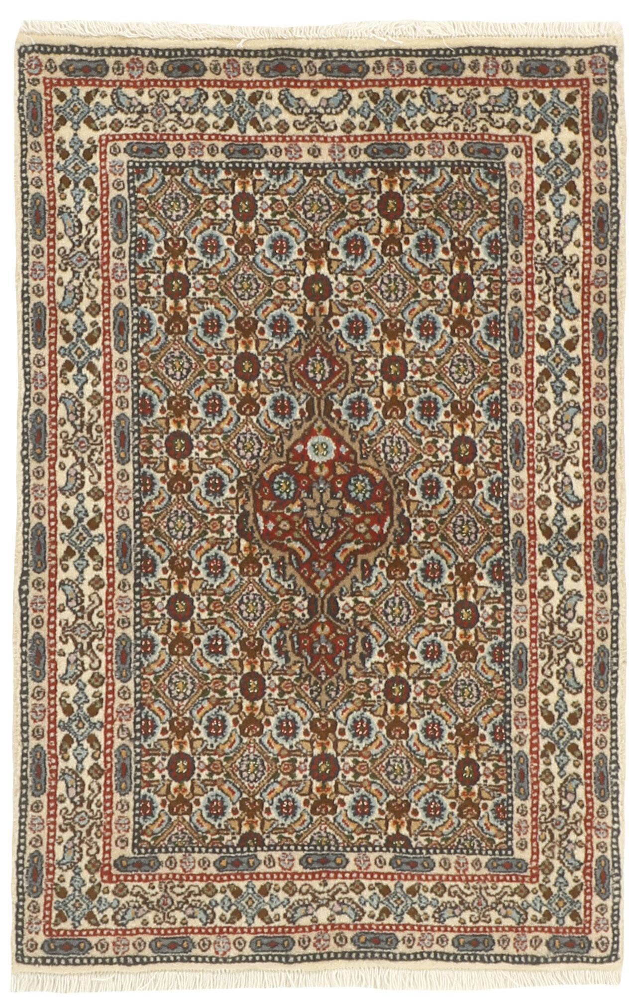 Moud est une petite ville au sud de Mashad, dans la province de Khorrasan. Les tapis de cette région se caractérisent par l'homogénéité de leurs motifs et de leur qualité. La chaîne et la trame sont en coton et le velours en laine. Les bordures sont une version de la bordure persane traditionnelle en tortue. Les tapis sont fabriqués dans toutes les tailles. Les tapis Moud sont souvent copiés en Inde, en raison de leur remarquable homogénéité. Les motifs caractéristiques de Moud sont parmi les plus uniformes, les plus réguliers et les plus facilement reconnaissables de la province de Khorrasan. Les Moud Mahi sont fabriqués dans des tons beige, rouge clair ou bleu, avec des motifs Mahi sur toute la surface ou avec un médaillon en forme d'étoile. Mahi signifie poisson et le motif Mahi est le motif le plus couramment utilisé dans les véritables tapis persans. En l'observant de près, vous pouvez voir un étang entouré de quatre poissons.