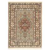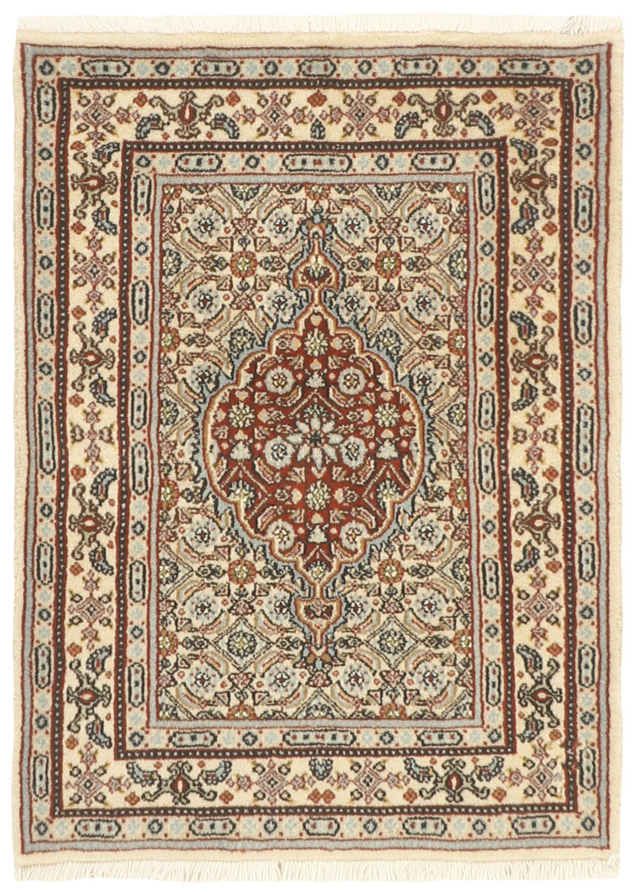 Moud est une petite ville au sud de Mashad, dans la province de Khorrasan. Les tapis de cette région se caractérisent par l'homogénéité de leurs motifs et de leur qualité. La chaîne et la trame sont en coton et le velours en laine. Les bordures sont une version de la bordure persane traditionnelle en tortue. Les tapis sont fabriqués dans toutes les tailles. Les tapis Moud sont souvent copiés en Inde, en raison de leur remarquable homogénéité. Les motifs caractéristiques de Moud sont parmi les plus uniformes, les plus réguliers et les plus facilement reconnaissables de la province de Khorrasan. Les Moud Mahi sont fabriqués dans des tons beige, rouge clair ou bleu, avec des motifs Mahi sur toute la surface ou avec un médaillon en forme d'étoile. Mahi signifie poisson et le motif Mahi est le motif le plus couramment utilisé dans les véritables tapis persans. En l'observant de près, vous pouvez voir un étang entouré de quatre poissons.