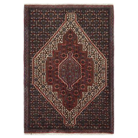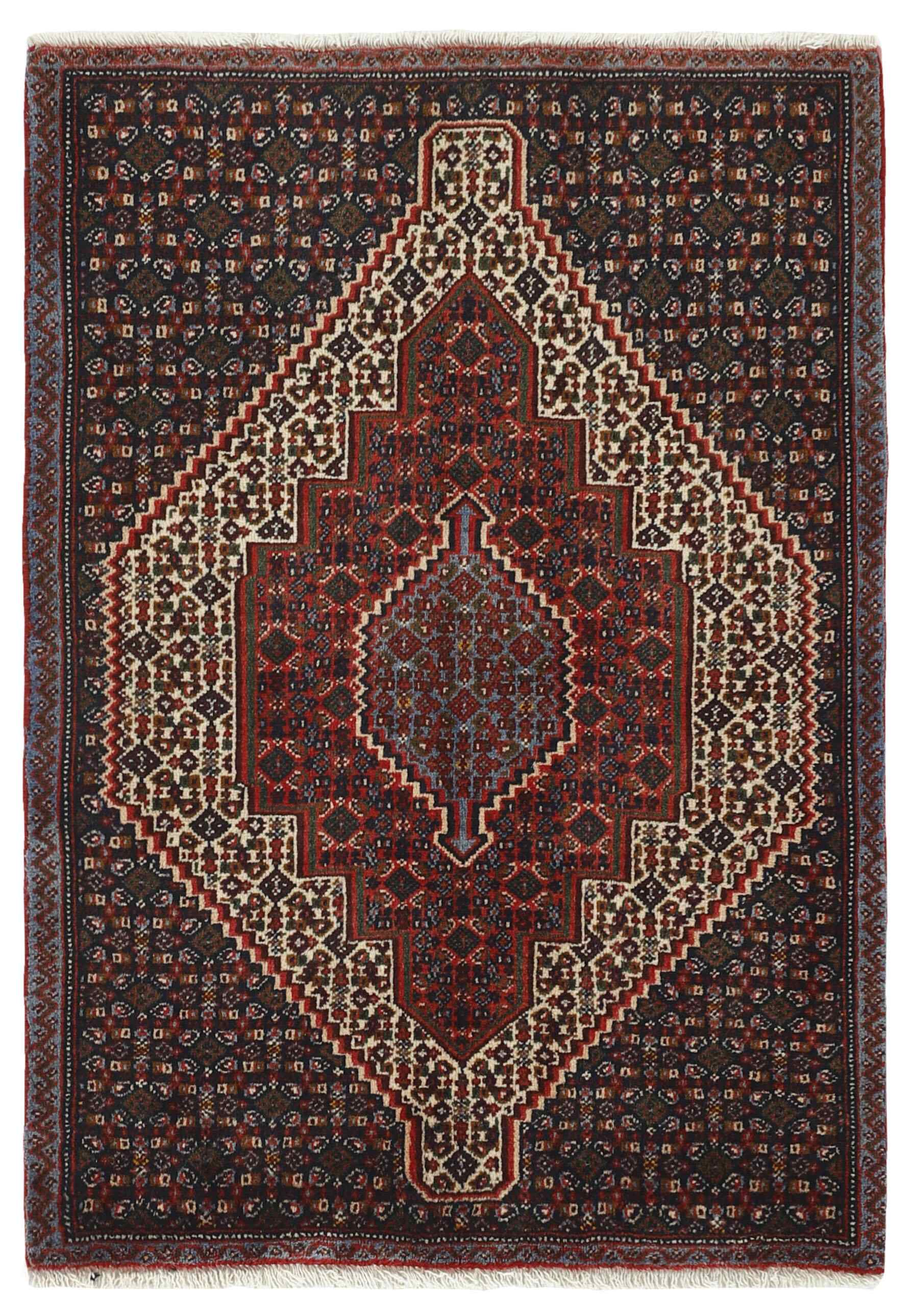 Seneh, dans le Sanadaj, est la capitale de la province du Kurdistan, au nord-ouest de l'Iran. Elle compte environ 300 000 habitants, la plupart étant des Kurdes de la tribu Gurani. Les tapis Seneh sont facilement reconnaissables à leur méthode de nouage, ainsi qu'aux couleurs des motifs et à la laine utilisée. Ils ont généralement une trame simple et le dos des tapis est souvent grossier et granuleux, car la laine est filée à la main avant le nouage. Parfois, on peut voir un nouage ferme de type Bidjar. Les couleurs caractéristiques sont le bleu profond, le vert, le rouge foncé et le blanc. La laine Seneh est l'une des meilleures qualités de laine en Iran : ferme et durable, avec un éclat profond, résultat de la haute altitude, de la végétation clairsemée et des températures extrêmes. Les noueurs tribaux de la région utilisent le même type de laine. Au 19e siècle, les tapis Seneh étaient célèbres pour leur finesse et la variété de leurs motifs, tandis que la production moderne est moins fine et moins variée. Le nœud Ghiordis est généralement utilisé, mais vous trouverez également des tapis de Seneh avec le nœud Seneh. Le tapis Seneh typique présente un champ à motifs Herati, avec une série de médaillons géométriques, les uns dans les autres, chacun répétant le motif avec une couleur de fond différente. Parfois, on retrouve des motifs plus anciens et plus uniformes : Boteh, Vekili, Gol-Farang (bouquets de fleurs naturalistes de style européen) ou Gol-i-Bulbul (oiseaux et fleurs).