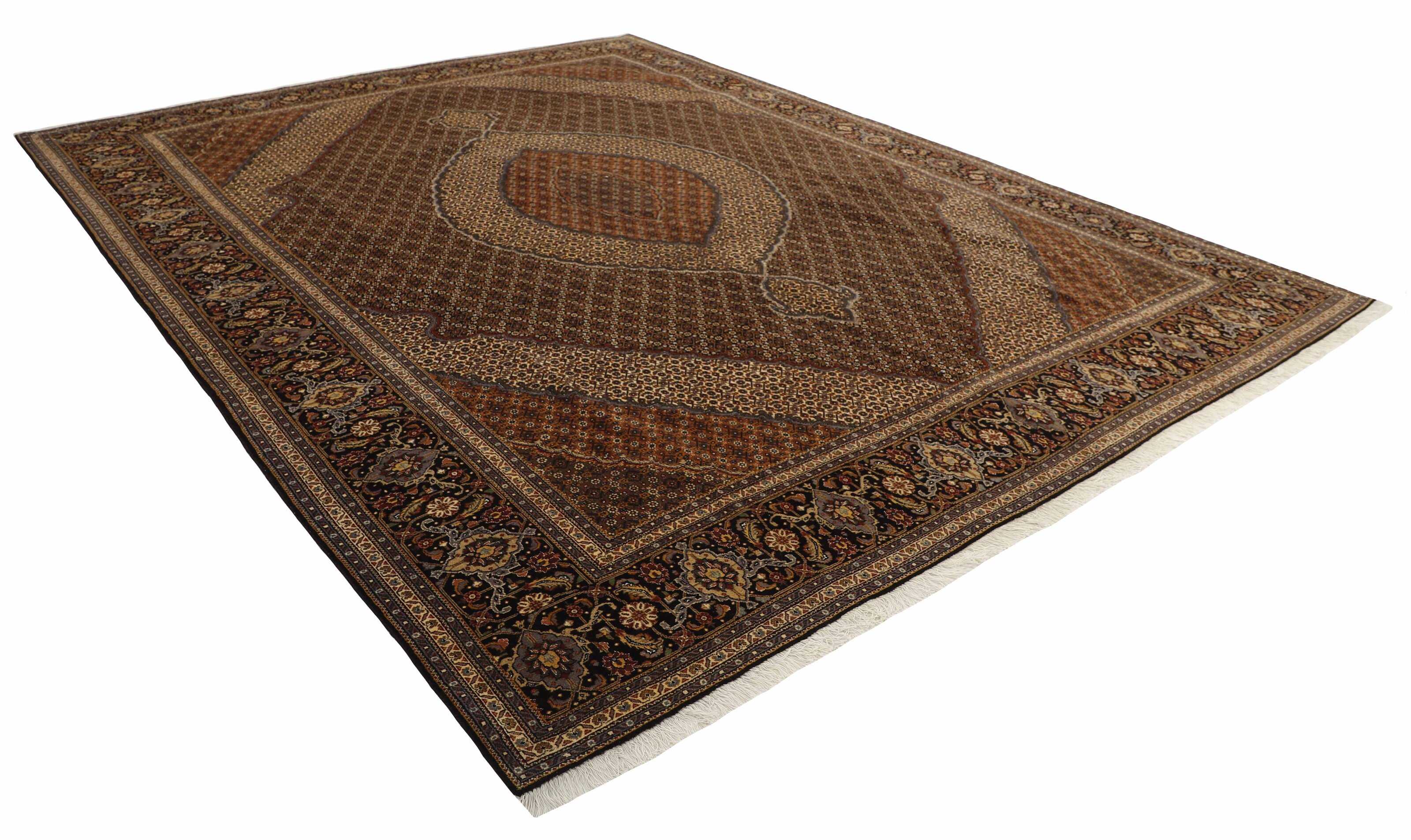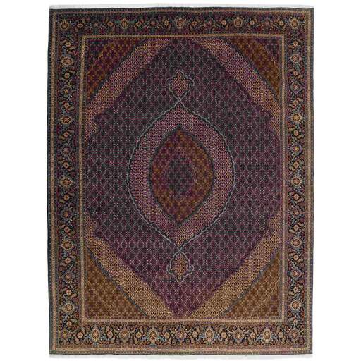 Tabriz est l'une des villes les plus importantes d'Iran. Elle compte 1,5 million d'habitants et est la capitale de la province de l'Azerbaïdjan oriental. Étant l'une des plus grandes régions productrices de tapis de Perse, les tapis de Tabriz sont exportés dans toutes les qualités, du plus simple au plus luxueux. Les meilleures qualités sont divisées en deux catégories principales : le Tabriz Mahi, également connu sous le nom de « motif de poisson de Tabriz » (le motif en forme de feuille du tapis est appelé Mahi, ce qui signifie « poisson »), et le Tabriz Nagsheh, qui signifie motif. Dans ce contexte, il fait référence aux motifs et symboles figuratifs de Keshan et d'Ispahan, qui ont inspiré le tapis Tabriz Nagsheh. Les noueurs sont incroyablement habiles et ils ont inventé un type spécial de crochet, qu'ils peuvent utiliser à la place de leurs doigts pour nouer les nœuds. La chaîne et la trame sont en coton, et le velours est en laine, souvent avec de la soie tissée dans les qualités les plus fines. Les couleurs des meilleurs tapis sont fines et raffinées. Les qualités les plus brutes ont des couleurs vives et sont rarement exportées. Les tapis de Tabriz sont souvent numérotés, comme Tabriz 50, ce qui est une indication de qualité. Le Tabriz 50 a 500 000 nœuds par m2. Les tapis de Tabriz sont considérés comme étant durables et de très haute qualité.