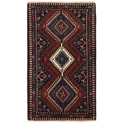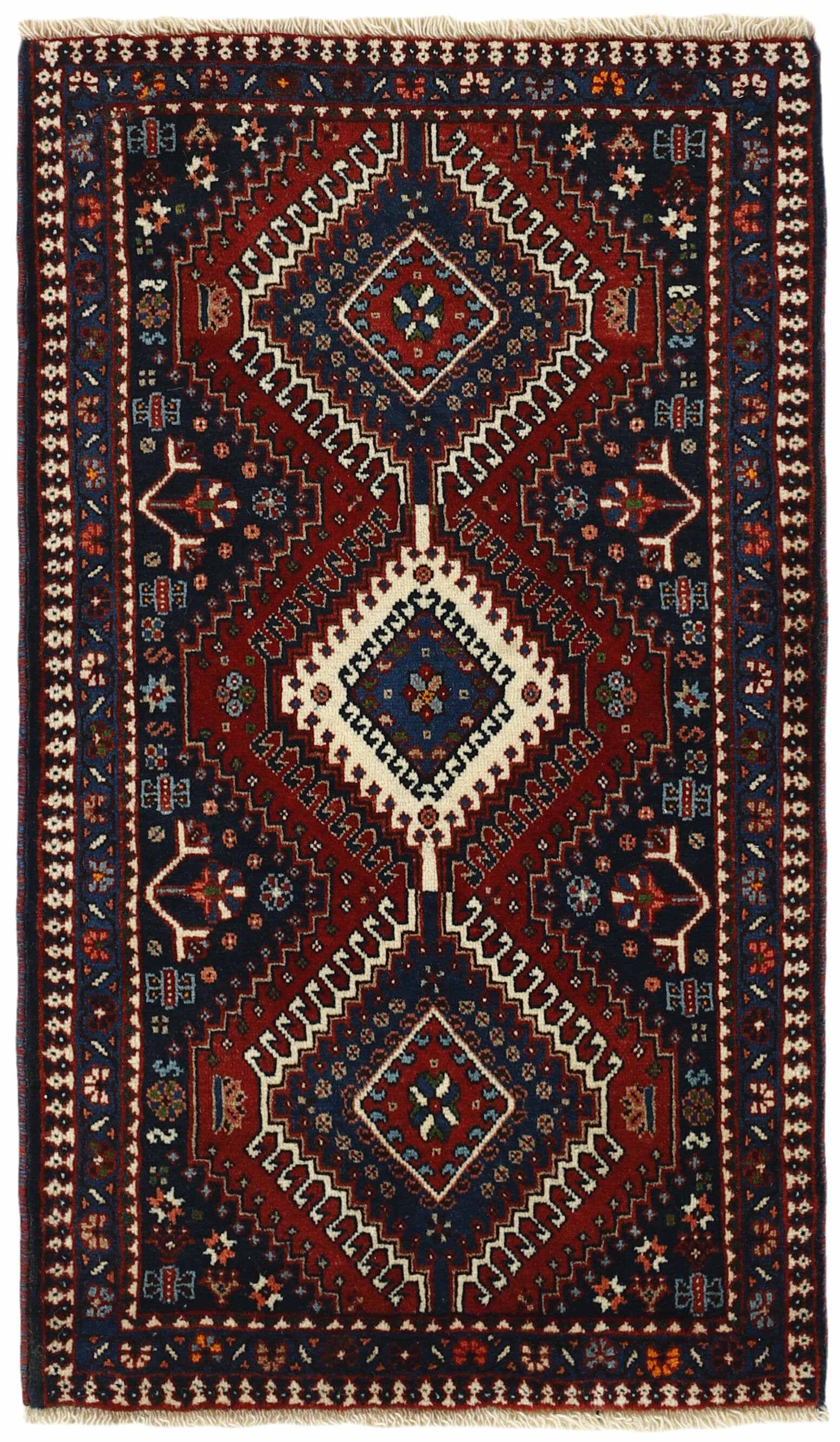 Les tapis colorés du sud de l'Iran ont été appelés Yalameh et sont principalement fabriqués dans et autour du village d'Aliabad dans la province du Fars. Les tapis de cette origine étaient autrefois appelés Shekarlu, mais ils étaient très rares. Ils étaient traditionnellement plus colorés que les autres tapis du sud de l'Iran, dont les couleurs se limitaient au rouge et au bleu foncé. Ces dernières années, l'offre de Shekarlu a été limitée, mais un nouveau type de tapis est arrivé sur le marché dans les années 60 et 70 : les Yalameh. Ils étaient tout aussi colorés que les tapis Shekarlu, mais avec une plus forte emphase sur le bleu. Le nouage et les motifs sont généralement plus uniformes que ceux des tapis Shekarlu. Ils partagent de nombreuses caractéristiques avec les tapis tribaux : ils sont 100 % laine, et les couleurs vives et les motifs géométriques sont abondamment utilisés. Bien que la laine soit particulièrement douce et brillante, elle est filée à la machine et les couleurs présentent un degré de variation plus important que la normale pour les tapis tribaux, avec de douces nuances de rouge, rose, bleu, vert et jaune. Les motifs, cependant, sont tout à fait traditionnels.