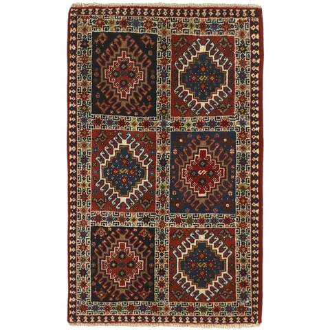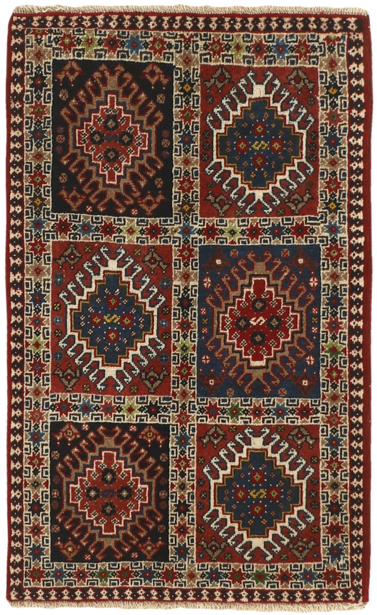 Les tapis colorés du sud de l'Iran ont été appelés Yalameh et sont principalement fabriqués dans et autour du village d'Aliabad dans la province du Fars. Les tapis de cette origine étaient autrefois appelés Shekarlu, mais ils étaient très rares. Ils étaient traditionnellement plus colorés que les autres tapis du sud de l'Iran, dont les couleurs se limitaient au rouge et au bleu foncé. Ces dernières années, l'offre de Shekarlu a été limitée, mais un nouveau type de tapis est arrivé sur le marché dans les années 60 et 70 : les Yalameh. Ils étaient tout aussi colorés que les tapis Shekarlu, mais avec une plus forte emphase sur le bleu. Le nouage et les motifs sont généralement plus uniformes que ceux des tapis Shekarlu. Ils partagent de nombreuses caractéristiques avec les tapis tribaux : ils sont 100 % laine, et les couleurs vives et les motifs géométriques sont abondamment utilisés. Bien que la laine soit particulièrement douce et brillante, elle est filée à la machine et les couleurs présentent un degré de variation plus important que la normale pour les tapis tribaux, avec de douces nuances de rouge, rose, bleu, vert et jaune. Les motifs, cependant, sont tout à fait traditionnels.