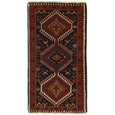 Les tapis colorés du sud de l'Iran ont été appelés Yalameh et sont principalement fabriqués dans et autour du village d'Aliabad dans la province du Fars. Les tapis de cette origine étaient autrefois appelés Shekarlu, mais ils étaient très rares. Ils étaient traditionnellement plus colorés que les autres tapis du sud de l'Iran, dont les couleurs se limitaient au rouge et au bleu foncé. Ces dernières années, l'offre de Shekarlu a été limitée, mais un nouveau type de tapis est arrivé sur le marché dans les années 60 et 70 : les Yalameh. Ils étaient tout aussi colorés que les tapis Shekarlu, mais avec une plus forte emphase sur le bleu. Le nouage et les motifs sont généralement plus uniformes que ceux des tapis Shekarlu. Ils partagent de nombreuses caractéristiques avec les tapis tribaux : ils sont 100 % laine, et les couleurs vives et les motifs géométriques sont abondamment utilisés. Bien que la laine soit particulièrement douce et brillante, elle est filée à la machine et les couleurs présentent un degré de variation plus important que la normale pour les tapis tribaux, avec de douces nuances de rouge, rose, bleu, vert et jaune. Les motifs, cependant, sont tout à fait traditionnels.